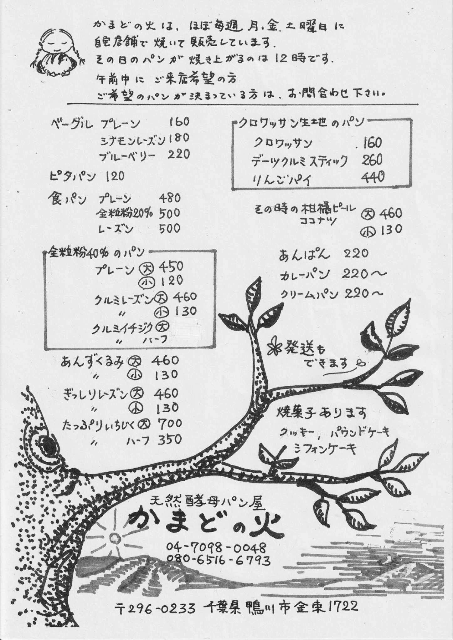 かまどの火は千葉県鴨川市の山の中にあるちいさなパン屋です。 原材料は国産小麦、オーガニックドライフルーツ&ナッツ、海塩。天然酵母は、ホシノ酵母と自家培養の酵母を使用しています。クロワッサンはバターを使用しますが、他のパンは油脂、砂糖、卵は使用していません。 手ごねで作っていますので、数に限りがあります。ご来店の際は、お電話いただければ安心です。